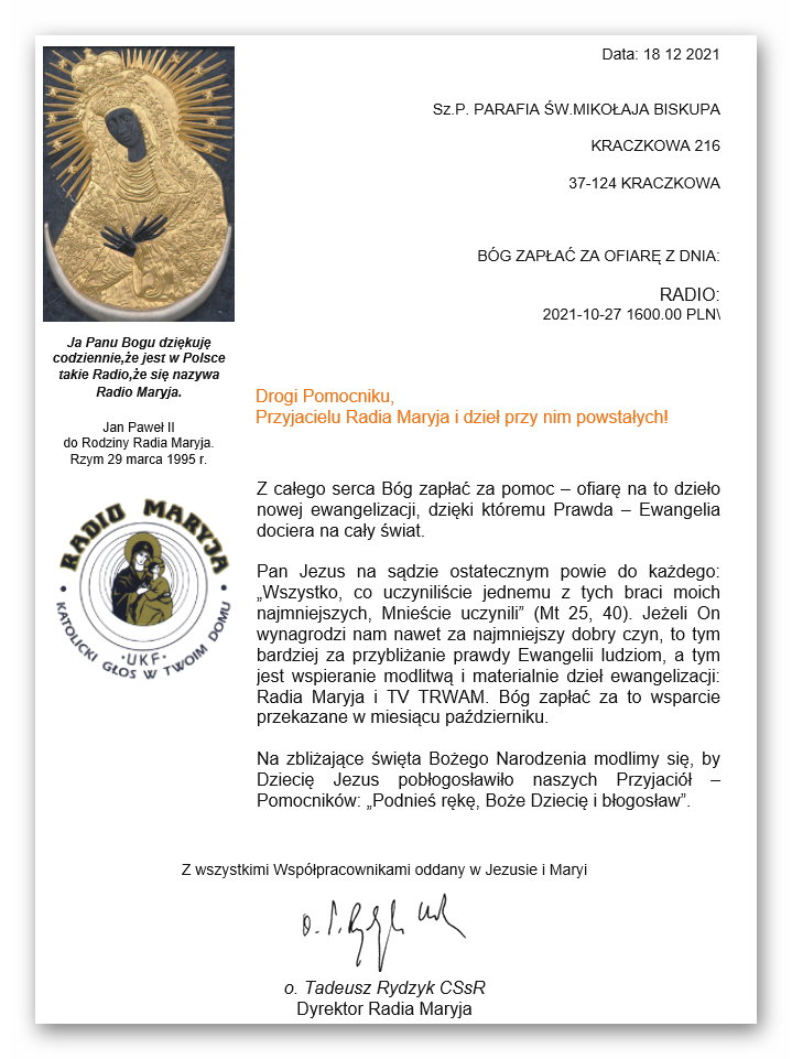 PODZIĘKOWANIE OD RADIA MARYJA - PAŹDZIERNIK