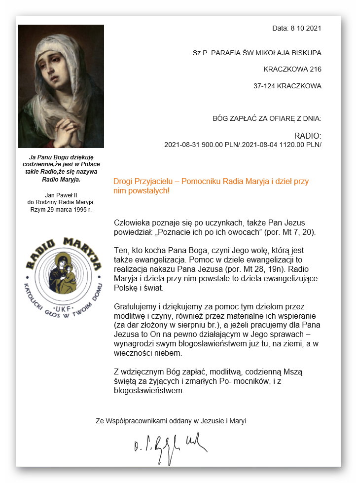 PODZIĘKOWANIE OD RADIA MARYJA - SIERPIEŃ