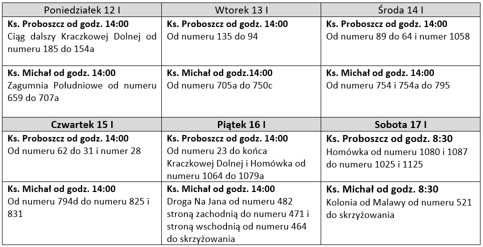 W tym tygodniu kontynuujemy wizytę duszpasterską w następującym porządku: